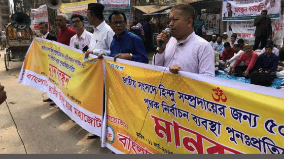 আগামী জাতীয় সংসদ নির্বাচনে হিন্দু সম্প্রদায়ের জন্য ৫০টি সংরক্ষিত আসন ও পৃথক নির্বাচন ব্যবস্থা পুনঃপ্রতিষ্ঠার দাবি জানিয়েছে বাংলাদেশ জাতীয় হিন্দু মহাজোট। গতকাল শনিবার জাতীয় প্রেস ক্লাব প্রাঙ্গণে আয়োজিত মানববন্ধনে এ দাবি জানান সংগঠনের নেতাকর্মীরা।